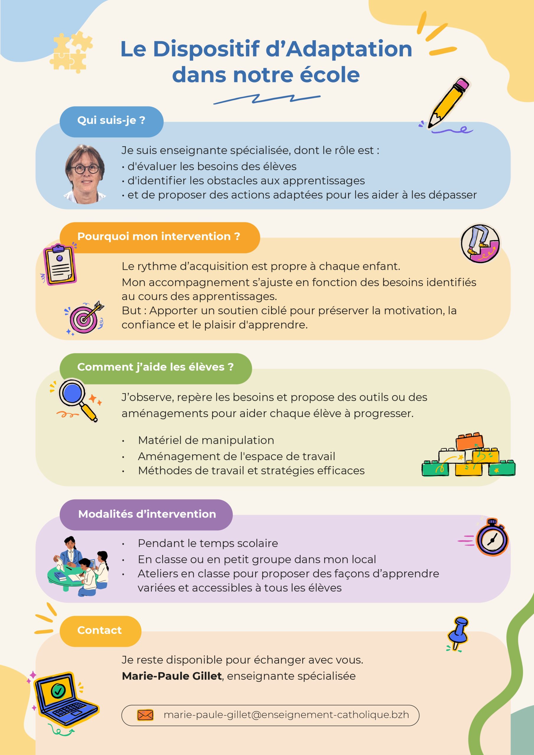Un dispositif d’adaptation animé par Marie-Paule Gillet, enseignante spécialisée, pour apprendre à son rythme, reprendre confiance et s’épanouir à l’école.